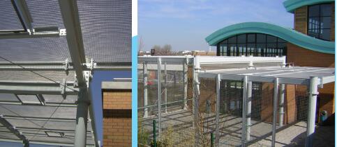 Large enclosure outside a railway station. Prevents vandalism and objects being thrown down from the road above. Woven mesh provides a high open area and allows light and ventilation through.